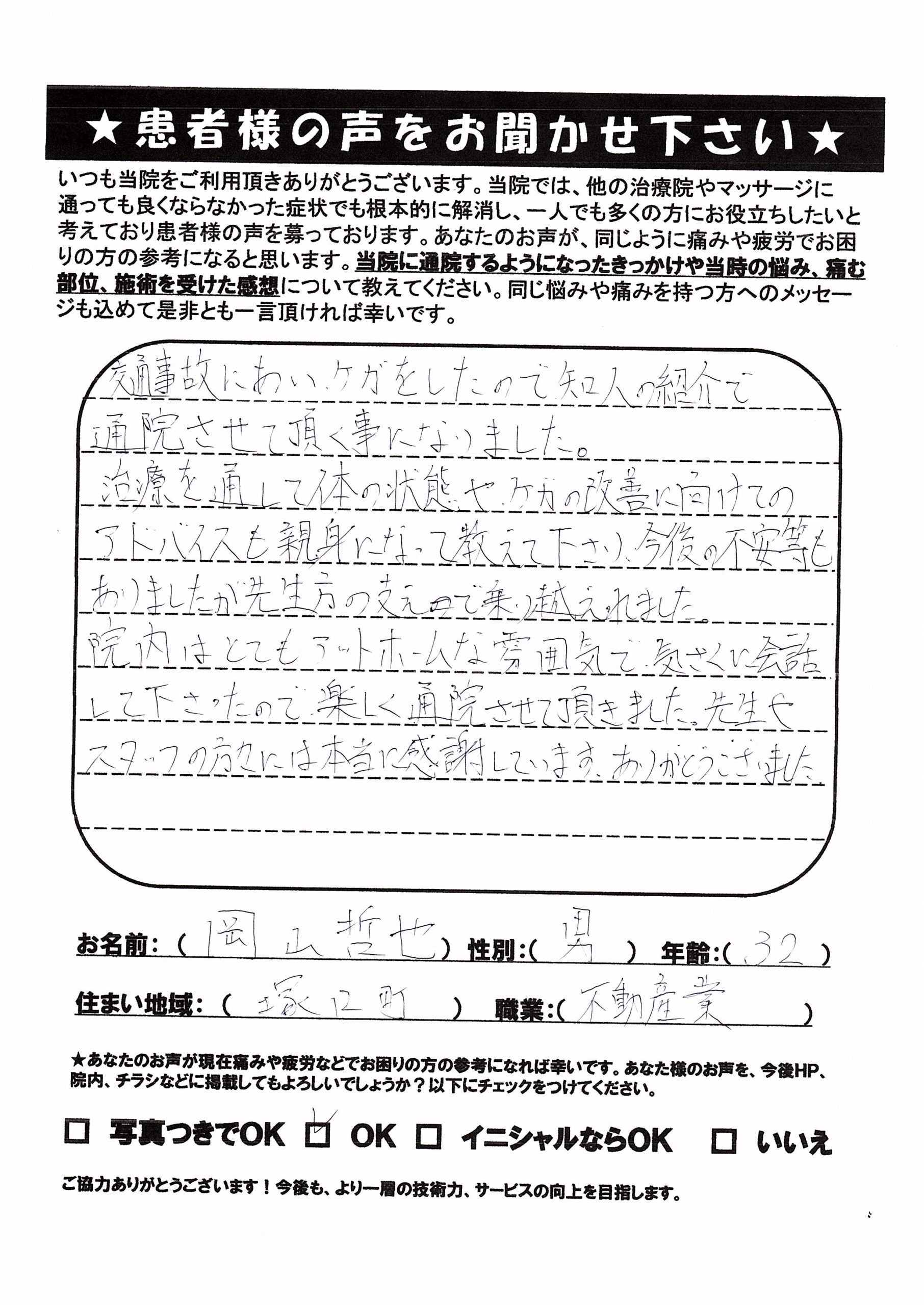 コメントありがとうございました。交通事故でのお怪我は保険会社とのやり取りをしながらの治療になりますので、不安やわからない事なども、多くあったと思いますが私たちスタッフ一同にお任せください。これからも、お身体に何かあればお気軽にご相談下さい!!
