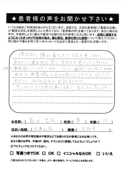 仕事柄(デスクワーク)、慢性的な肩こりや首の痛みが続いて、これまでいろいろな治療院に行っていましたが、なかなか良くなりませんでした。スポーツで腰痛になってしまった時に、HPで治療院を探していたところ、こちらに通院させてもらって、痛みも早い段階で治まり、体の状態も詳しく説明もあり、安心して通院することが出来ました。自宅で出来るマッサージやストレッチなども説明頂いたので、痛みも早く改善されて良かったです。これからも宜しくお願いします。