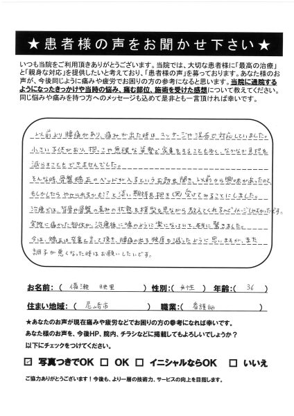 嘘のように楽になりました。 備瀬 映里 尼崎市 武庫之荘 30代 女性