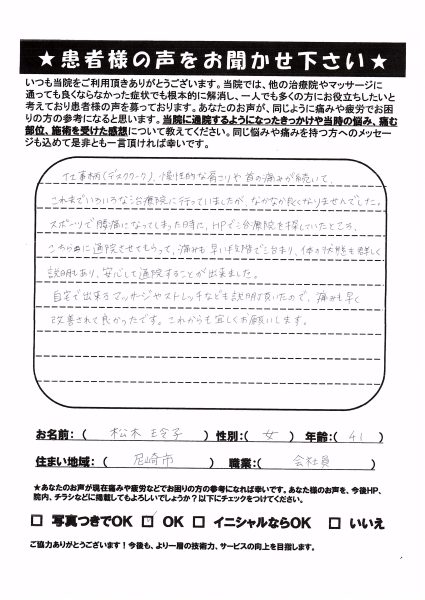 改善されて良かったです。 松木 玲子 尼崎市 40代 女性